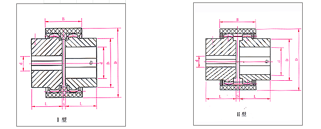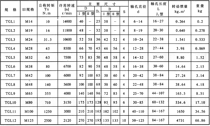 本聯(lián)軸器適用于聯(lián)接兩同軸線傳動軸系,并具有一定的補償兩軸相對位移性能的聯(lián)軸器,具有一定的彈性,工作環(huán)境溫度-20~80℃,傳遞公稱轉(zhuǎn)矩為10~2500KN·m。 TGL型 聯(lián)軸器參數(shù)與尺寸(mm)